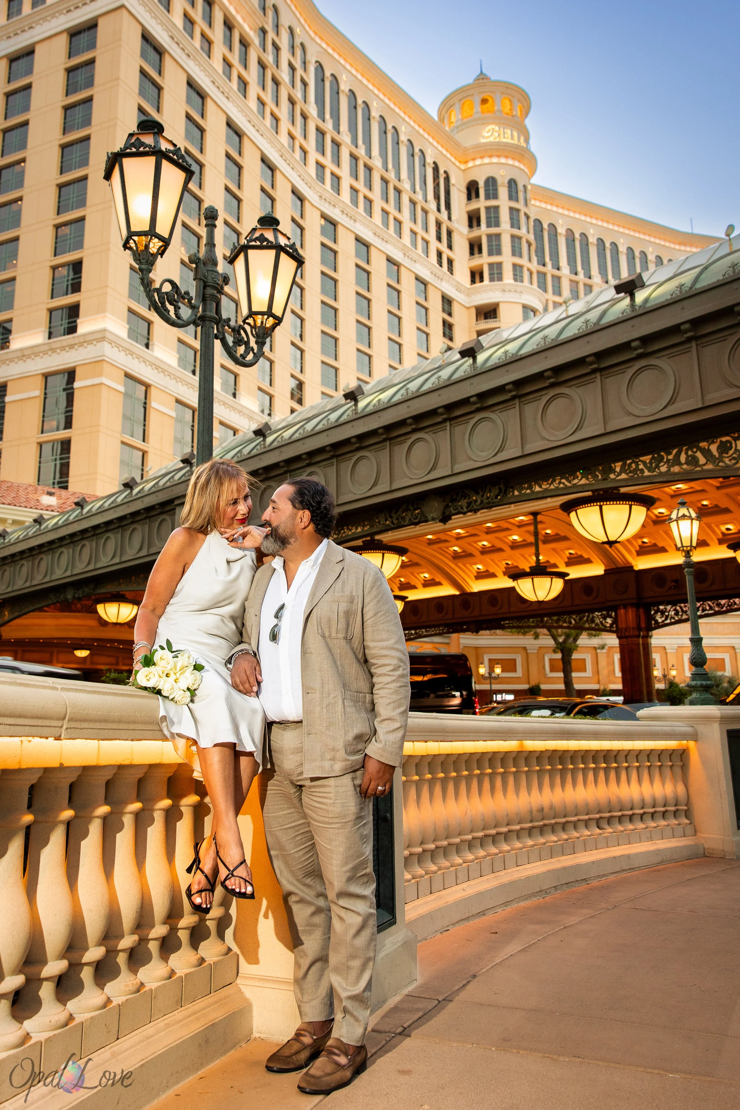 With arms wrapped tight, they took a quiet moment together, just soaking it all in. The Las Vegas skyline, the soft hum of fountains nearby, and the warm glow of the setting sun made this one of those rare pauses you never forget.