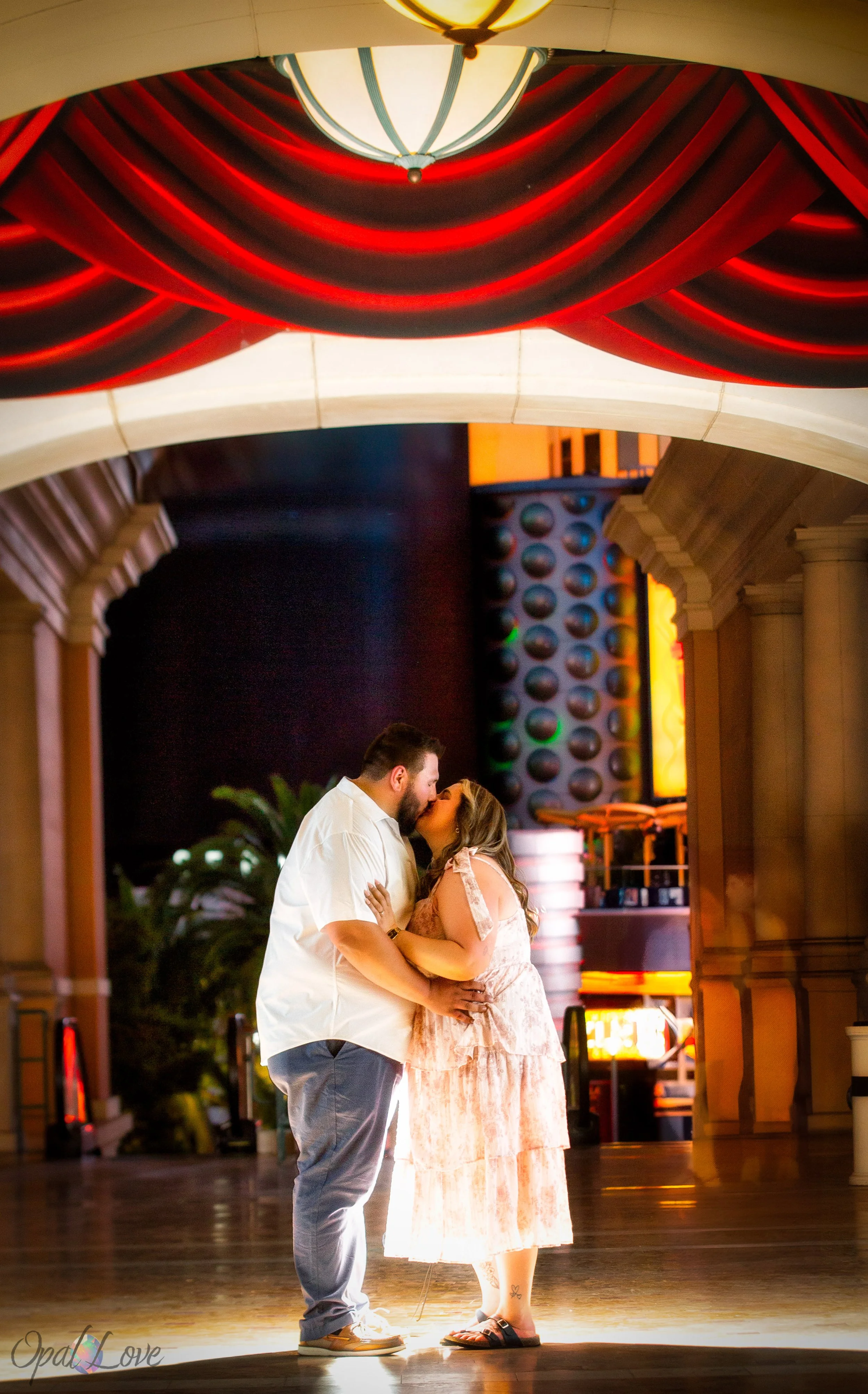 We wandered into a dreamy spot under an arched walkway, where the soft red lights gave us that warm, cinematic glow. These two naturally melted into the moment no posing needed. Just real connection and a bit of Vegas flair.